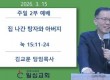 ilsim Contents 일심나눔터 공지사항 경조부 게시판 행사갤러리 새가족소개 섬김부서 유아부 유치부 유년부 초등부 학생부 청년부 남전도회 여전도회 예배설교 목사님설교 초청강사설교 특별영상 찬양 교회소개 교회비전 예배안내 섬기는이들 교회발자취 오시는길 목사님설교 목사님설교 > 예배설교 > Home 목사님설교 목록 Total 10건 1 페이지 10 집 나간 탕자와 아버지 10 관리자 | 03-17 | (눅 15:11-24) 11 또 이르시되 어떤 사람에게 두 아들이 있는데 12 그 둘째가 아버지에게 말하되 아버지여 재산 중에서 내게 돌아올 분깃을 내게 주소서 하는지라… 9 마른 뼈가 살아나 큰 군대가 되다 9 관리자 | 03-10 | (겔 37:1-10) 1 여호와께서 권능으로 내게 임재하시고 그의 영으로 나를 데리고 가서 골짜기 가운데 두셨는데 거기 뼈가 가득하더라 2 나를 그 뼈 사방으로 지나가게… 8 안심하라 내니 두려워 말라 8 관리자 | 03-03 | (마 14:22-33) 22 예수께서 즉시 제자들을 재촉하사 자기가 무리를 보내는 동안에 배를 타고 앞서 건너편으로 가게 하시고 23 무리를 보내신 후에 기도하러 따로 … 7 마귀의 시험에서 이기는 길 7 관리자 | 02-24 | (마 4:1-11) 1 그 때에 예수께서 성령에게 이끌리어 마귀에게 시험을 받으러 광야로 가사 2 사십 일을 밤낮으로 금식하신 후에 주리신지라 3 시험하는 자가 예… 6 성공적인 신앙생활의 원리 6 관리자 | 02-19 | (눅 5:1-11) 1 무리가 몰려와서 하나님의 말씀을 들을새 예수는 게네사렛 호숫가에 서서 2 호숫가에 배 두 척이 있는 것을 보시니 어부들은 배에서 나와서 그물을 씻… 5 다니엘 처럼 5 관리자 | 02-10 | (단 1:8-21) 8 다니엘은 뜻을 정하여 왕의 음식과 그가 마시는 포도주로 자기를 더럽히지 아니하리라 하고 자기를 더럽히지 아니하도록 환관장에게 구하니 9 하나님이 … 4 너희를 향하신 하나님의 뜻 4 관리자 | 02-03 | (살전 5:16-18) 16 항상 기뻐하라 17 쉬지 말고 기도하라 18 범사에 감사하라 이것이 그리스도 예수 안에서 너희를 향하신 하나님의 뜻이니라 3 영적 전쟁에서 이겨야 합니다 3 관리자 | 01-20 | (출 17:8-16) 8 그 때에 아말렉이 와서 이스라엘과 르비딤에서 싸우니라 9 모세가 여호수아에게 이르되 우리를 위하여 사람들을 택하여 나가서 아말렉과 싸우라 내일 … 2 신압의 집을 잘 지읍시다 2 관리자 | 01-06 | (고전 3:10-15) 10 내게 주신 하나님의 은혜를 따라 내가 지혜로운 건축자와 같이 터를 닦아 두매 다른 이가 그 위에 세우나 그러나 각각 어떻게 그 위에 세울까를 조심… 1 다시 일어납시다 1 관리자 | 12-30 | (요 21:1-17) 1 그 후에 예수께서 디베랴 호수에서 또 제자들에게 자기를 나타내셨으니 나타내신 일은 이러하니라 2 시몬 베드로와 디두모라 하는 도마와 갈릴리 가나… 게시물 검색 검색대상 제목 내용 제목+내용 회원아이디 회원아이디(코) 글쓴이 글쓴이(코) 검색어 필수