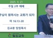 일심나눔터 공지사항 경조부 게시판 행사갤러리 새가족소개 섬김부서 유아부 유치부 유년부 초등부 학생부 청년부 남전도회 여전도회 예배설교 목사님설교 초청강사설교 특별영상 찬양 교회소개 교회비전 예배안내 섬기는이들 교회발자취 오시는길